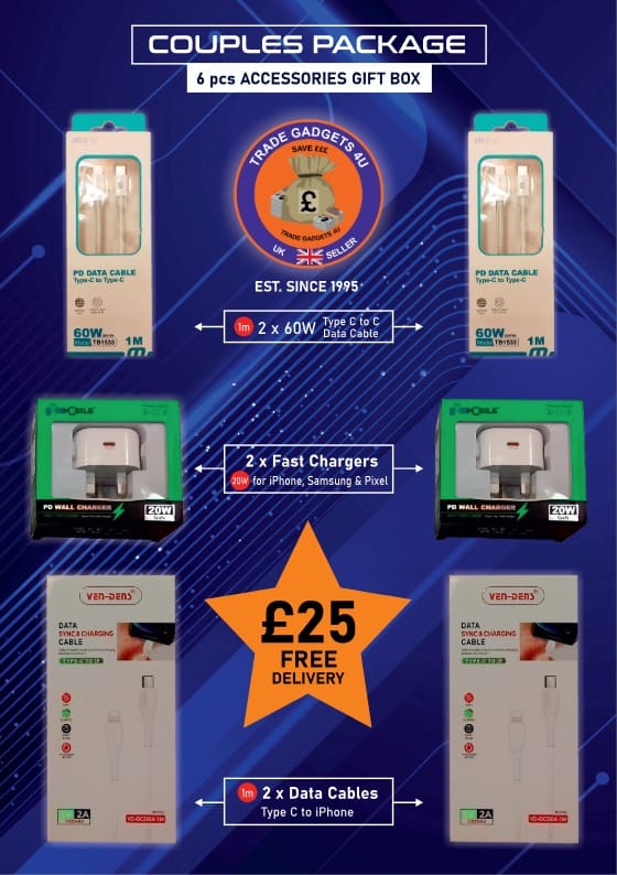 Couples Package Includes: 2 x 1-meter 60W Type C to C data cables 2 x 20W Fast Chargers for iPhone, Samsung & Pixle 2 x 1-meter Data Cables type C to iPhones
