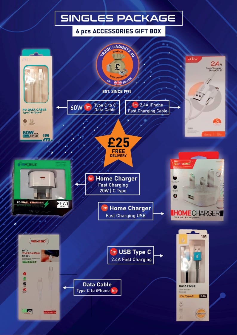 Singles Package includes: 60W 1-meter type C to C data cable 2.4A 1-meter Fast Charging cable Home Charger, fast charging 20W | C Type Home Charger, fast charging USB 2.4A 1-meter USB Type C Data Cable 1-meter Type C to iPhone